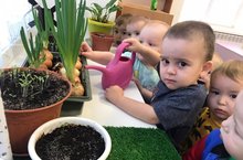 В ясельной группе детского сада дети под руководством воспитателя посадили огород на окне. Они выращивают петрушку, щавель, кориандр, руколу , цветы. А уже подросший зелёный лук дети кушают во время обеда.