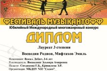 Безнең талантлы балаларыбыз "Музыкантофф фестивале" юбилей халыкара күп жанрлы конкурсында катнаштылар, анда жюри рәисе музыкант, телевидениедә тапшырулар алып баручы Родион Газманов иде. 700 катнашучы арасында финалга нибары 156 кеше үтте, шул исәптән Воеводин Родион 2 дәрәҗә лауреат, Воеводин Родион һәм Мифтахов Эмиль-3 дәрәҗә лауреатлар булдылар. Педагогларны, ата-аналарны һәм балаларны лаеклы нәтиҗәләре белән котлыйбыз һәм яңа җиңүләр телибез!!!