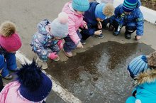 В ходе сегодняшнего наблюдения и объяснения дети научились устанавливать связь погодных явлений. Узнали, что вода превратилась в лед. В холодное время лужи покрываются тонкой корочкой льда, так как вода замерзает. Дети убедились что лёд твёрдый. Потрогав руками лёд, дети убедились, что он гладкий и холодный, а если встать на него ногами, то можно поскользнуться.