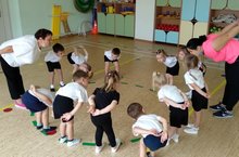 Воспитатель Московская Н.Н. совместно с инструктором по физической культуре Ессеной Е.В. провели развлечение с элементами здоровьесбережения с детьми второй младшей группы № 11 "Золотой ключик" по физической культуре. Дети совершили путешествие к друзьям в деревню, где живут домашние животные. По пути преодолевали различные препятствия: перешли по мостику, с кочки на кочку выполняли прыжки ( лёгкий бег, ходьба по кирпичикам с сохранением равновесия, прыжки на двух ногах, ходьба на носках). Выполняли общеразвивающие упражнения, изображая поватки домашних животных, поиграли в подвижные игры "Лохматый пёс", "Воробышки и кот". Разучили дыхательное упражнение "Воробышки", выполнили этюд на расслабление "Большие камни". Детям очень понравилась прогулка, которая помогла им проявить выразительность движений, эмоциональность, внимание, осторожность и взаимопомощь.