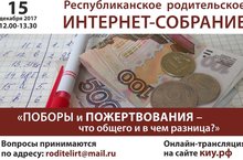 Уважаемые родители! 15 декабря с 12.00 по 13.30 состоится Республиканское родительское интернет- собрание "Поборы и пожертвования - что общего и в чем разница?"