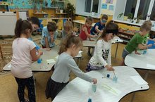 Менә 7нче "Почемучка" ның төркеменнән килгән балалар да бераз экспериментлар уткэрергэ карар иткән. Тәҗрибә барышында балалар су һәм буяулар үзлекләре белән таныштылар. Дәрес уен формасында узды. Балалар уен барышында бик күп уңай эмоцияләр алдылар. Су сыек, тәме, исе юк, шулай ук Чиста су үтә күренмәле һәм каты тәннән аермалы буларак, суның үз формасы юклыгын куреп белделэр. -