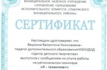 19 ноября 2015г. на базе МБ ДОУ детский сад № 18 «Ласточка» комбинированного вида ЕМР прошел региональный семинар «Я – талантлив». На семинаре выступила педагог Центра детского творчества Вешкина Валентина Николаевна.