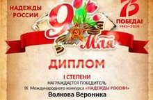 Учащаяся объединения "Я познаю мир" (руководитель Мазняк Л.И.) Волкова Вероника заняла 1 место в IX Международном конкурсе "Надежды России".