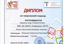 Диплом "За творческий подход" в Республиканском конкурсе научно-технического творчества и современных технологий "ТехноФест-2022" / "ТехноФест-2022" Республика фәнни-техник иҗат һәм заманча технологияләр конкурсында "Иҗат өчен" дипломы 14.11.2022