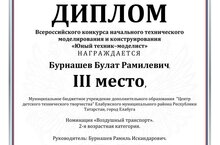 28.11.2022г. обучающийся объединения "Авиамоделирование" Бурнашев Булат под руководством педагога ДО Бурнашева Р.И. получил диплом за III место Всероссийского конкурса начального технического моделирования и конструирования "Юный техник-моделист".