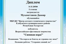 12.12.2022 г. обучающийся объединения "ТХТ" Мухаметзянов Данияр под руководством педагога ДО Арслановой Р.Р. участвовал в Всероссийском фестивале «Снежная пора!» и получил диплом I степени.