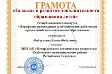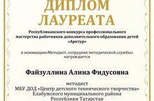 15 декабря методист Центра детского технического творчества Файзуллина Алина Фидусовна приняла участие в финальном очном этапе Республиканского конкурса профессионального мастерства работников дополнительного образования детей «Арктур» в номинации «Методист, сотрудник методической службы». Организаторы Конкурса – Татарстанская республиканская организация общероссийского профсоюза образования при поддержке Министерства образования и науки Республики Татарстан. Оператор Конкурса – ГБУ ДО «Республиканский центр внешкольной работы». В рамках данного Конкурса Файзуллина А.Ф. представила свою визитную карточку и провела методический семинар «Загадка пояснительной записки». Стала лауреатом в данной номинации и вошла в пятерку лучших методистов Республики Татарстан.