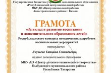31 ноября 2022 года педагог дополнительного образования первой квалификационной категории по НТМ Якушева Татьяна Геннадьевна приняла участие в Республиканском конкурсе методических разработок воспитательных мероприятий, организованном ГБУ ДО «РЦВР». Ее разработку мероприятия «Парки нашего города» отметили Грамотой «За вклад в развитие воспитания и дополнительного образования детей».