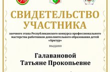 24 октябрь - 01 декабрь 2022 ел – башлангыч техник модельләштерү буенча югары квалификацияле өстәмә белем бирү педагогы Галаванова Татьяна Прокопьевна - «өстәмә гомуми белем бирү программасын гамәлгә ашыручы педагогик хезмәткәр» номинациясендә «Арктур» Балаларга өстәмә белем бирү хезмәткәрләренең һөнәри осталыгы республика конкурсының читтән торып этабында катнашты. Бәйгене оештыручылар-Татарстан Республикасы Мәгариф һәм фән министрлыгы ярдәмендә Бөтенроссия мәгариф профсоюзының Татарстан республика оешмасы. Конкурс операторы – «Республика мәктәптән тыш эшләр үзәге»ДБУ.