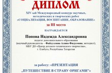 АНО «Научно-просветительский центр «Традиция» и историко-культурное молодежное научное общество «Самобытная Вятка» провели XIV Международный конкурс научных, методических и творческих работ «Социализация, воспитание, образование». Педагог д.о. «Начальное техническое моделирование» Попова Н.А. и методист Файзуллина А.Ф. с работой Презентация «Путешествие в страну Оригами» заняли в нём III место.