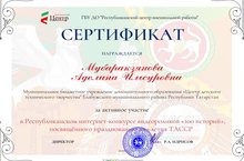 22 декабря 2020 года обучающаяся в объединении «Компьютерный дизайн» педагог ДО Аскарова О.О., Мубаракзянова Аделина Ильсуровна получила сертификат за активное участие в Республиканском интернет – конкурсе видеороликов «100 историй», посвященного празднованию 100 – летия ТАССР.