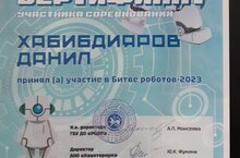24.11.2023 г. обучающийся объединения "Робототехника" Хабибдияров Данил под руководством педагога ДО Попыриной Е.П. принял участие в Республиканских соревнованиях "Битва роботов" на базе АНО "Детский технопарк "Кванториум" г.Набережные Челны.