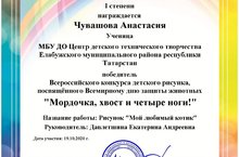 16 октября 2020 Чувашова Анастасия получила диплом первой степени за участие в Всероссийском конкурсе детского рисунка, посвящённого Всемирному дню защиты животных «Мордочка, хвост и четыре ноги!» педагог ДО Давлетшина Екатерина Андреевна объединение «Начальное техническое моделирование» получила благодарственное письмо. Поздравляем!