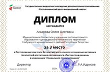 28 сентября 2020 года педагог ДО Аскарова Олеся Олеговна победила в Республиканском этапе Всероссийского конкурса социально активных технологий воспитания обучающихся «Растим гражданина». Поздравляем!