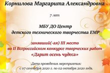 1октября 2020 года обучающаяся в объединение «НТМ» Карнилова Маргарита заняла III место во II Всероссийском конкурсе творческих работ «Дарит осень чудеса», педагог ДО Давлетшина Екатерина Андреевна получила благодарственное письмо. Поздравляем!