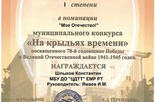 15.06.2023г. обучающийся объединения "Картинг" Шлыков Константин под руководством педагога ДО Ямаева И.М. принял участие в Муниципальном конкурсе «На крыльях времени», посвященным 78-й годовщине Победы в ВОВ 1941-1945 гг. и получил диплом I степени.