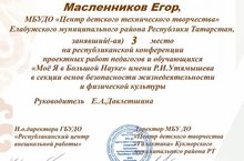 15.05.2023 елда "Җәяүле әлифбасы" берләшмәсе укучысы Егор Масленников педагог ДО Дәүләтшина Е.А. җитәкчелегендә «Минем Мин Зур фәндә» педагогларның һәм укучыларның проект эшләре республика конференциясендә катнашты һәм 3 урын өчен диплом алды.