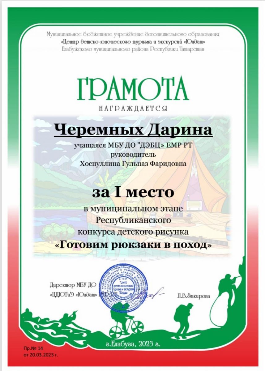 Черемных Дарина Грамота за 1 место Готовим рюкзаки в поход.jpg