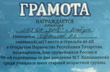 1 ноября 2017г. прошел муниципальный этап Открытого Первенства Республики Татарстан,посвещенный Дню оружейника России и 98-ой годовщине со дня рождения М.Т.Калашникова.Радовало то, что участвовали ребята разных возрастных категорий. Несмотря на свой возраст, учащиеся 6-го класса тоже показали хорошие результаты. Надеемся что они на следующий год будут уже в списке победителей. А в этом году в финал Первенства попали 2 команды под руководством Ларионова В.И. и Ибрагимова Р.К. Пожелаем им удачи в финале!