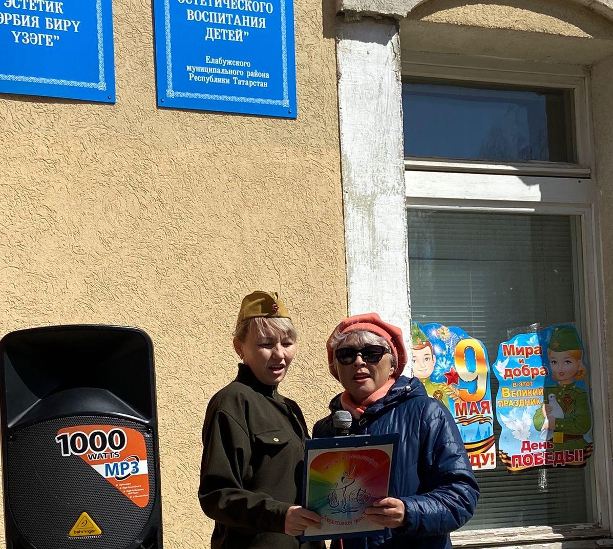 Согласну плану мероприятий Центра Эстетического Воспитания детей, приуроченных к празднованию 77 годовщины Победы в Великой Отечественной Войне, сегодня, на площадке перед МБУ ДО "ЦЭВД" ЕМР РТ состоялось мероприятие "Песни Великой Победы". Спеть песни на военную тематику вместе с руководителями вокальных коллективов "Новое поколение" - Салаховой Людмилой Максимовной и "Тамчылар" - Хабибуллиной Индирой Радиковной, смогли все желающие.