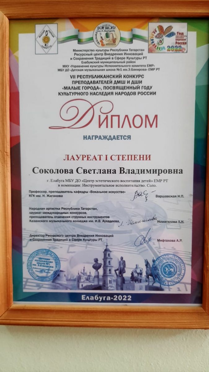 В Елабуге с 15 марта проходил заочный VII Республиканский конкурс преподавателей Детских музыкальных школ и Детских школ искусств "Малые города",посвященный году культурного наследия народов России, в котором приняла участие педагог МБУ ДО "ЦЭВД" ЕМР РТ Соколова Светлана Владимировна.