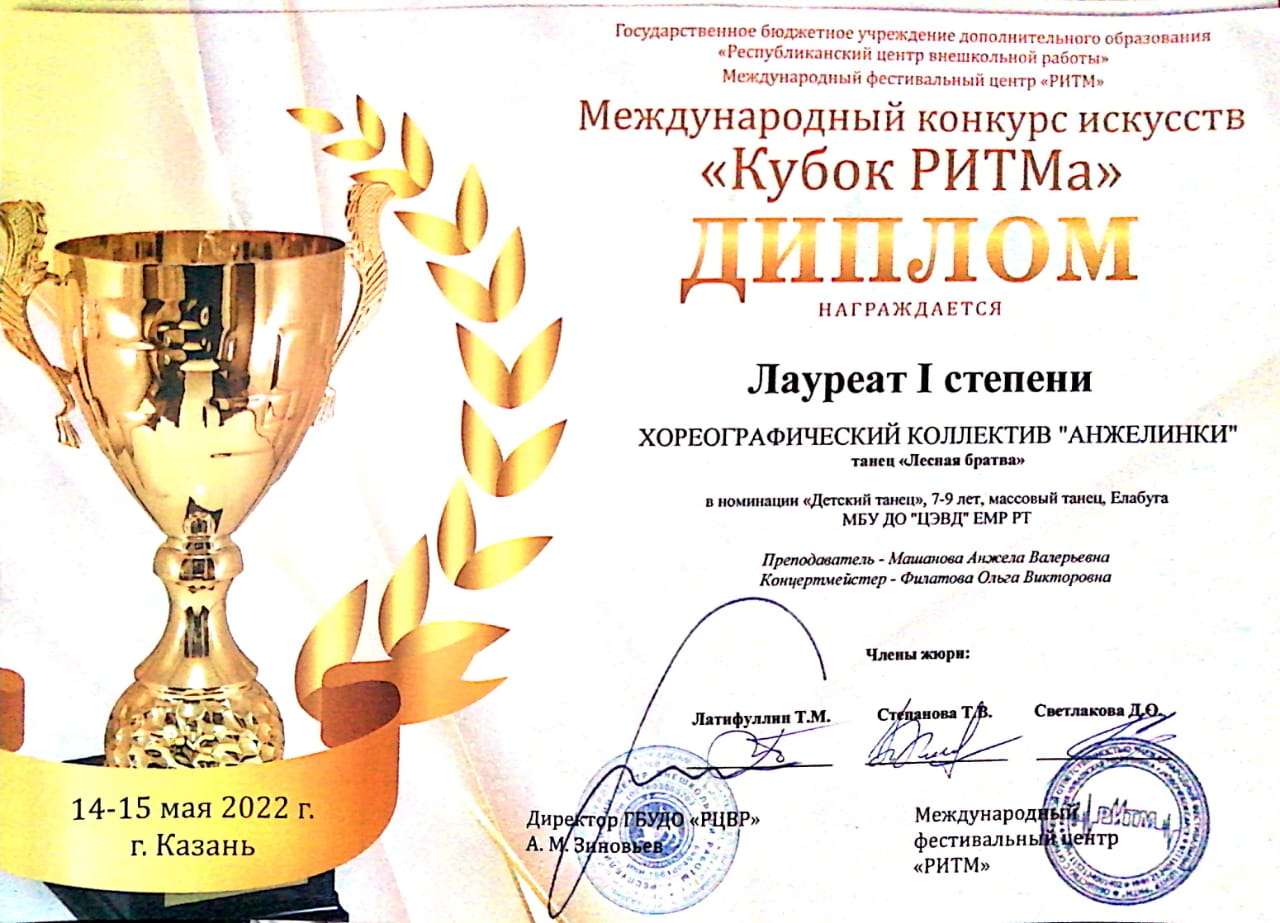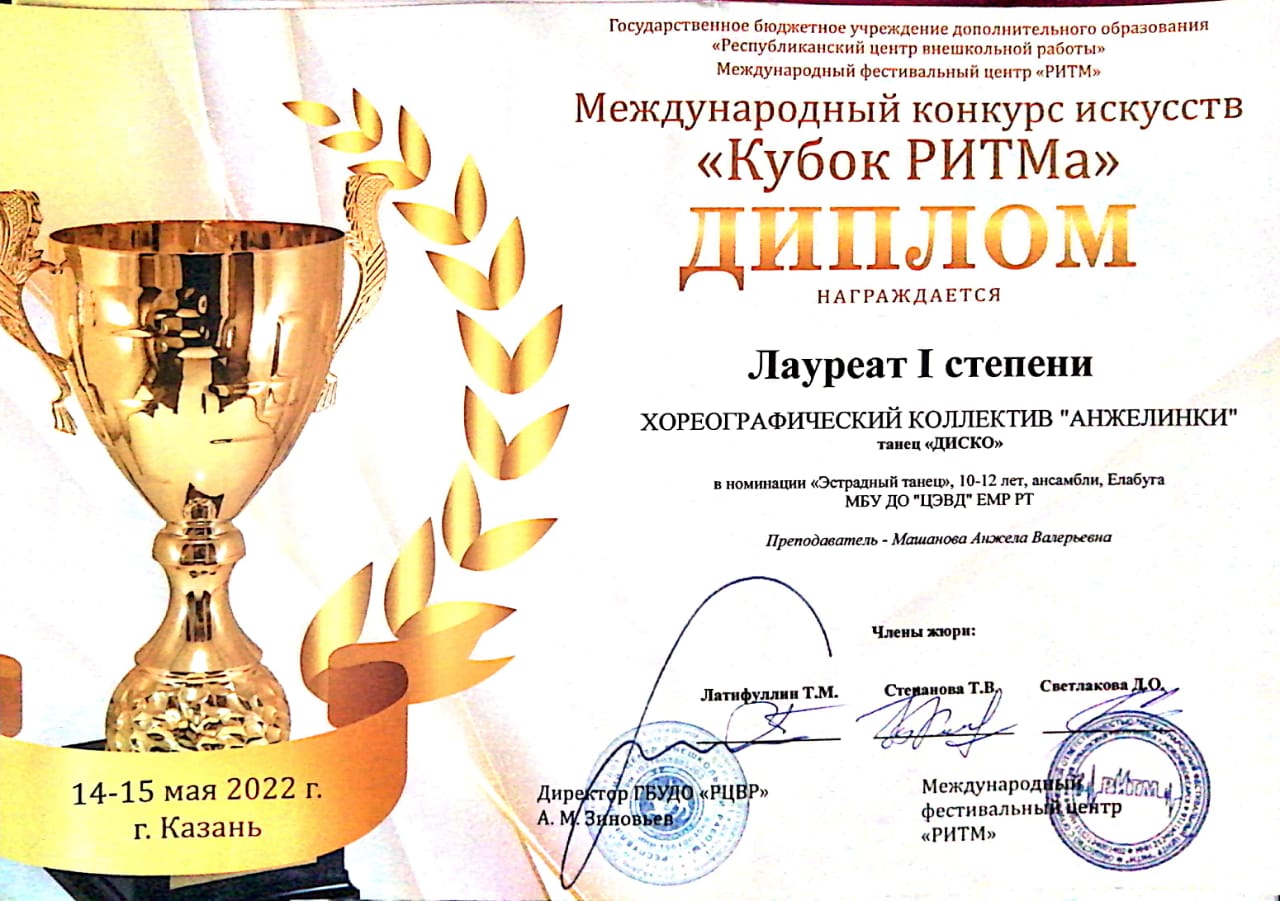 14 мая 2022 года в городе Казань при поддержке Государственного бюджетного учреждения дополнительного образования "Республиканский центр внешкольной работы" и международного фестивального центра "Ритм" состоялся Международный конкурс искусств "Кубок РИТМа", в котором принял участие хореографический коллектив "Анжелинки" Муниципального бюджетного учреждения дополнительного образования "Центр эстетического воспитания детей" Елабужского муниципального района.