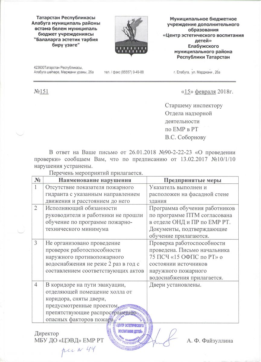 Предписание об устранении нарушений в МБУ ДО "ЦЭВД" ЕМР РТ № П-Р-76/21-Д от 20 августа 2021 года