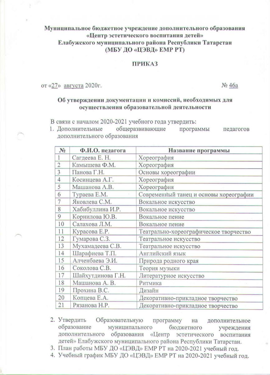 1. Приказ об утверждении документации и комиссии, необходимых для осуществления образовательной деятельности от 27.08.2020 года №46 а ( 1 стр.) (2 стр.)