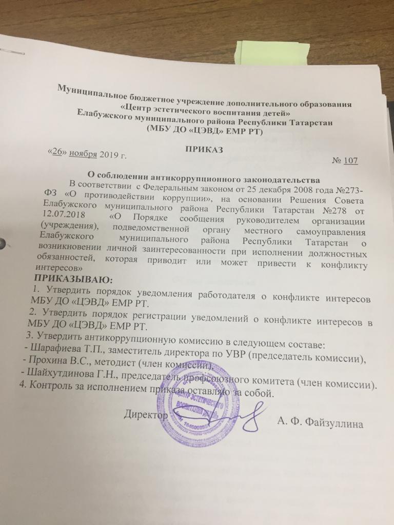 Приказ МБУ ДО ЦЭВД ЕМР РТ об антикоррупционной деятельности 2019 год