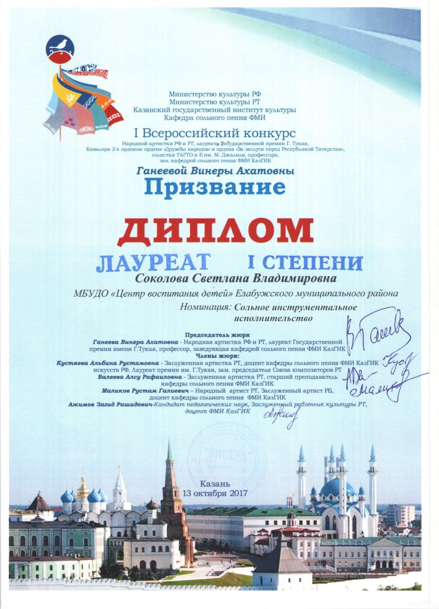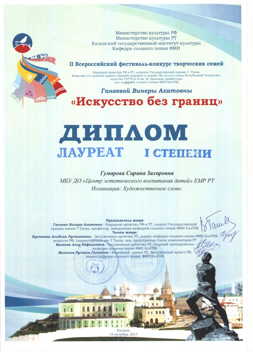 Всероссийский II конкурс народной артистки РФ и РТ, лауреата государственной премии Г. Тукая. Кавалера 2-х орденов: ордена «Дружбы народов» и ордена «За заслуги перед РТ», солистки ТАГТО и Б им. М.Джалиля, профессора, зав. Кафедрой сольного пения ФМИ КазГИК Ганеевой Венеры Ахатовны творческих семей "Искусство без границ-2017" |