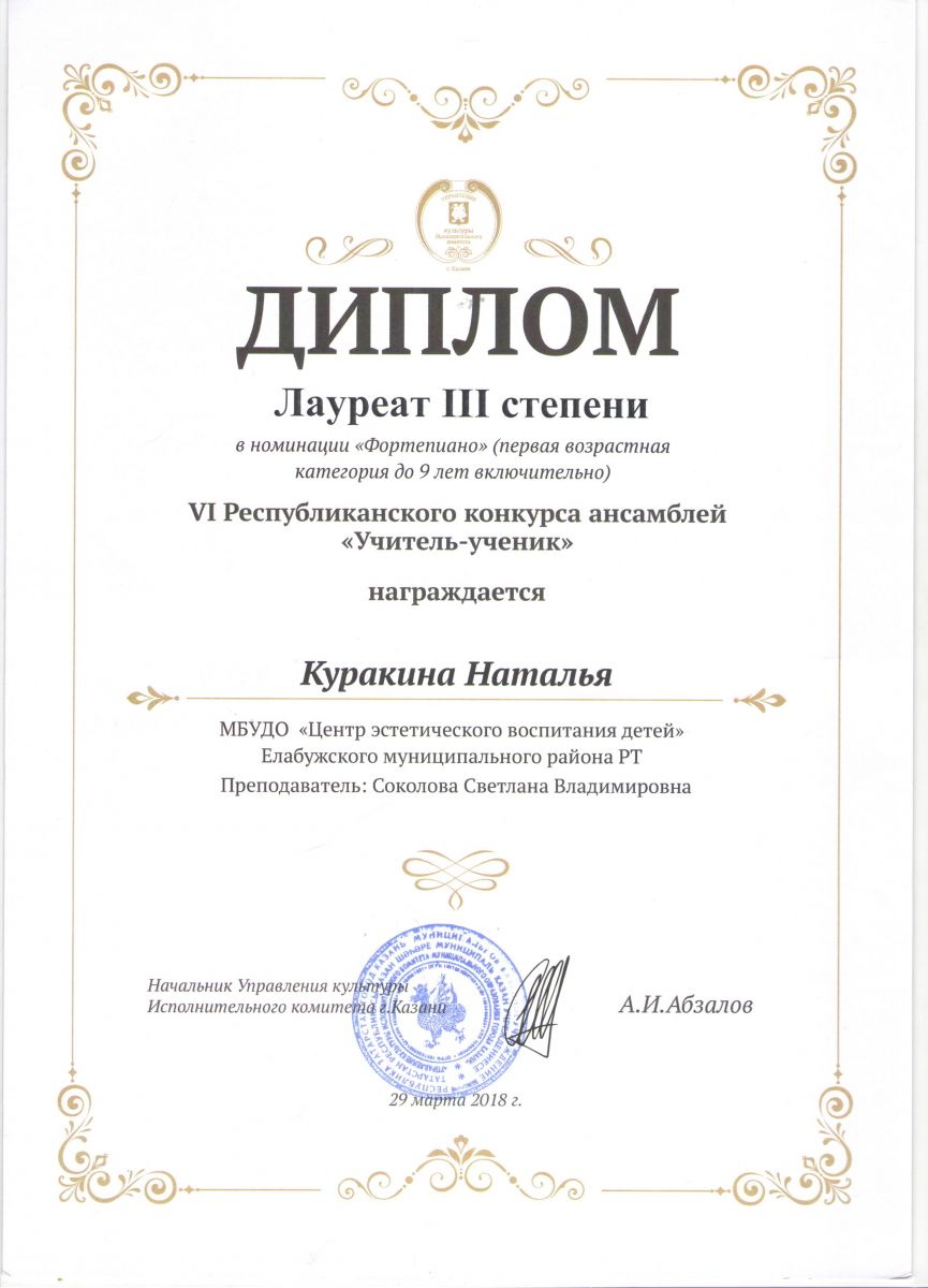45. VI конкурс ансамблей «Учитель – ученик» - Куракина Наталья - Теория музыки - Диплом Лауреата III степени