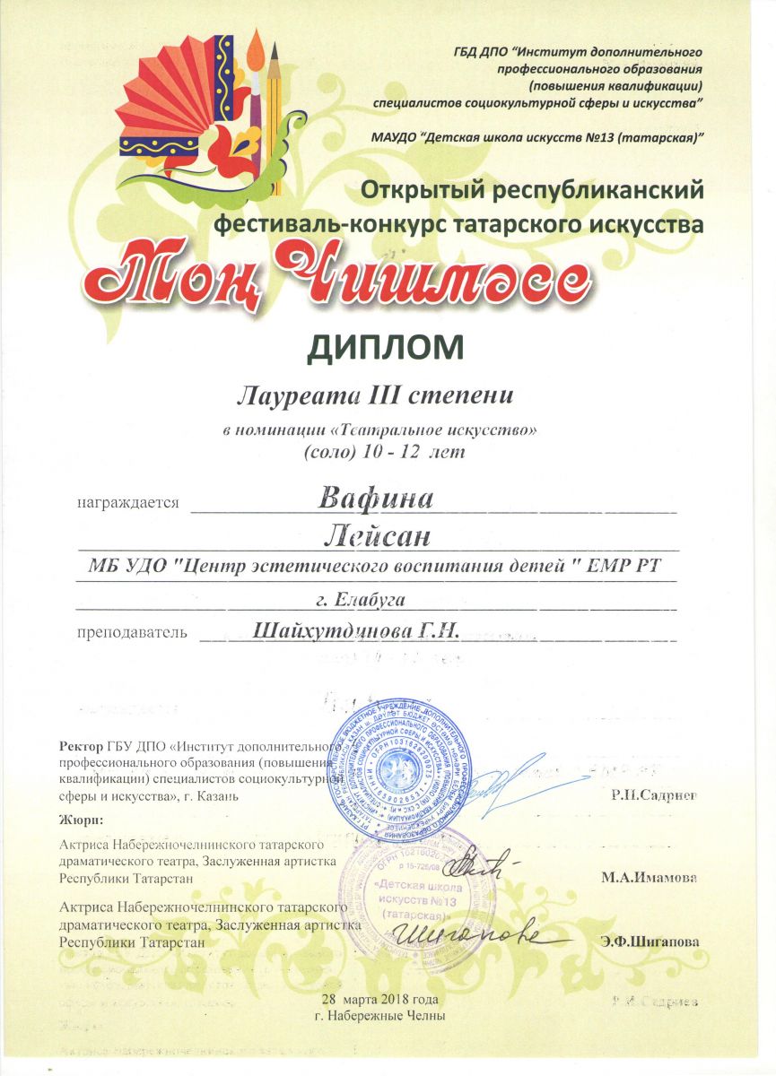 3. Открытый фестиваль - конкурс татарского искусства "Моң Чишмәсе" - Вафина Лейсан - Литературное творчество - Диплом Лауреата III степени