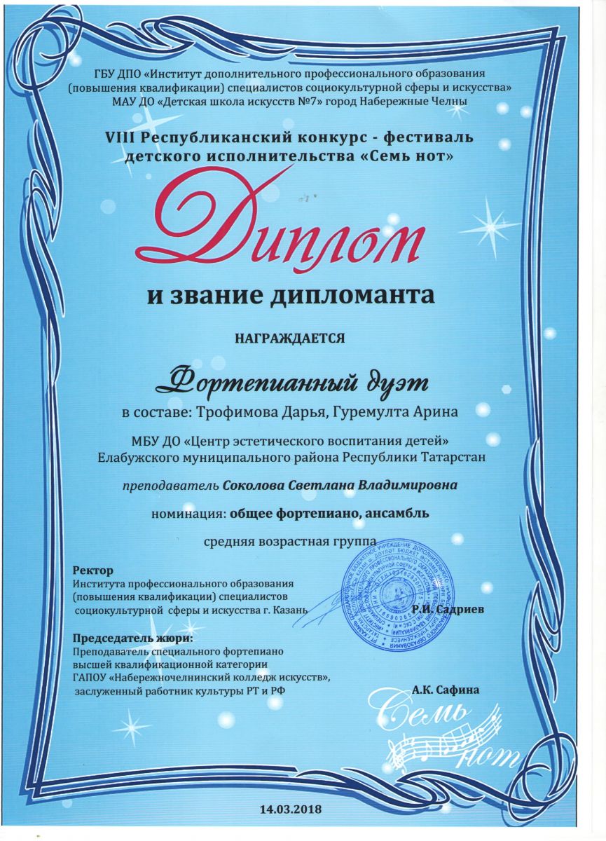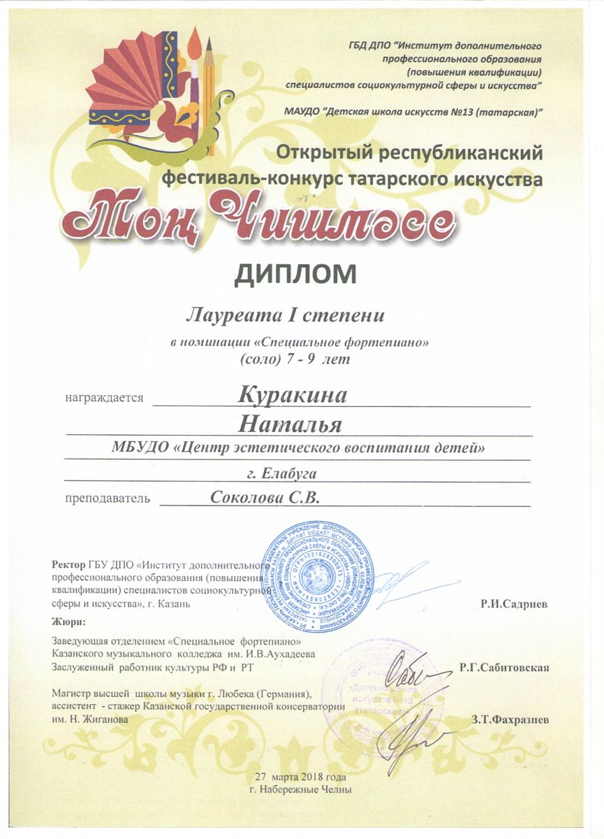 4. Открытый фестиваль - конкурс татарского искусства "Моң Чишмәсе" - Куракина Наталья - Теория музыки - Диплом Лауреата I степени