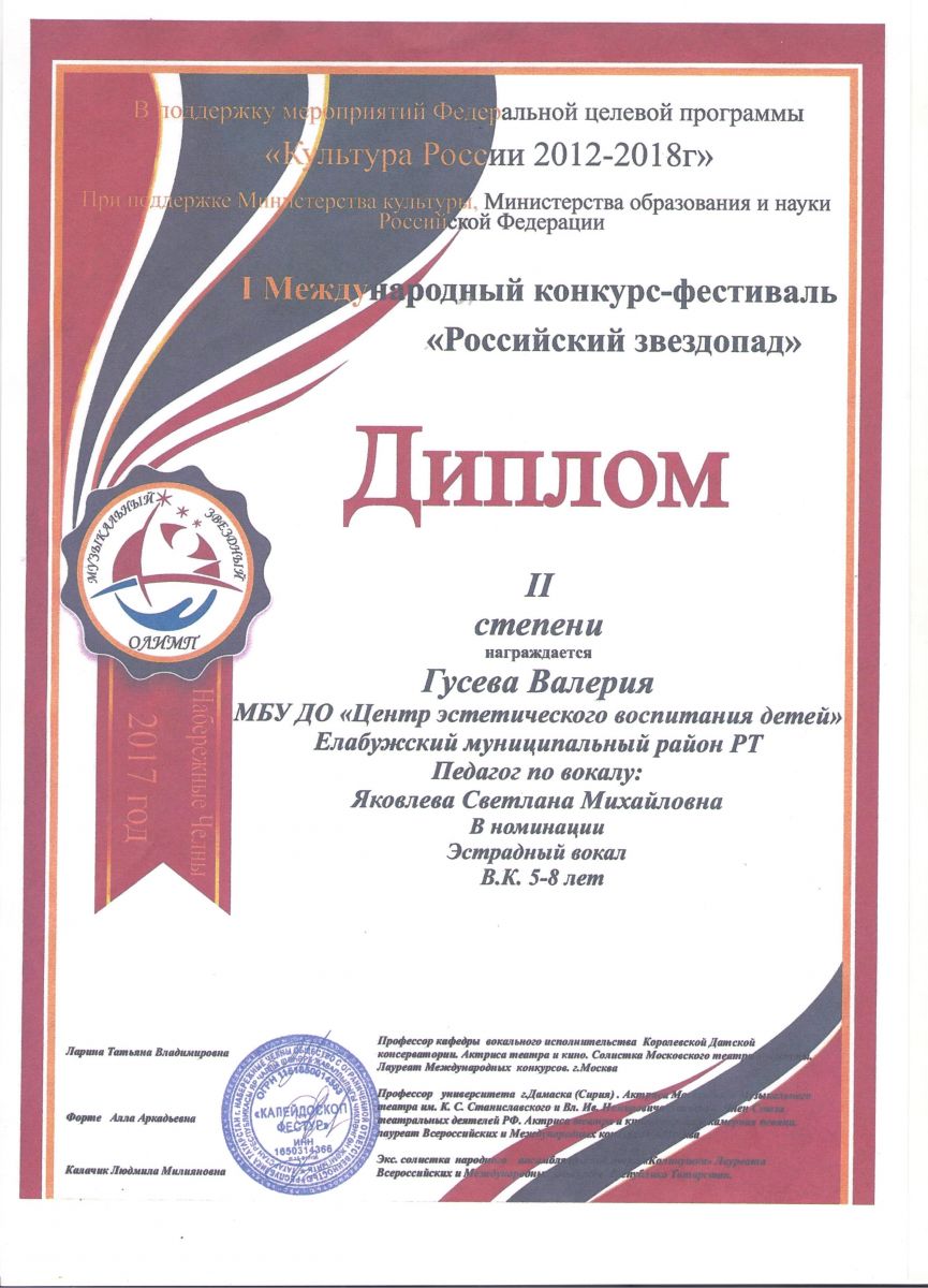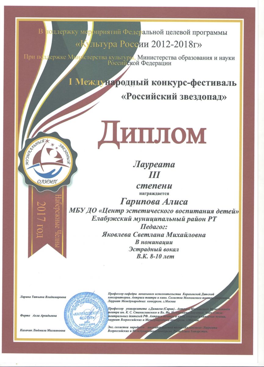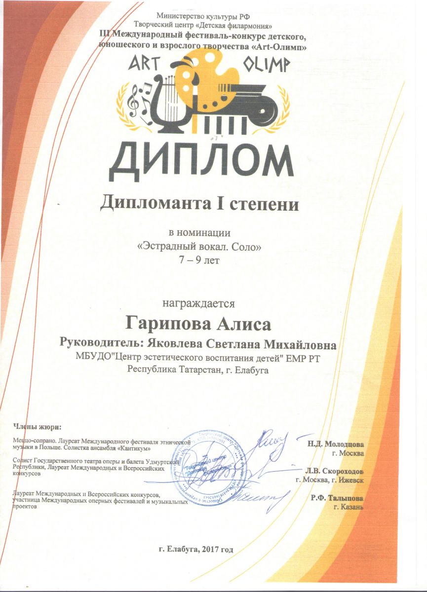 1. III фестиваль – конкурс детского, юношеского и детского творчества «Арт-Олимп» - Гарипова Алиса - Вокальное пение - Диплом Дипломанта I степени (7-9 ле)