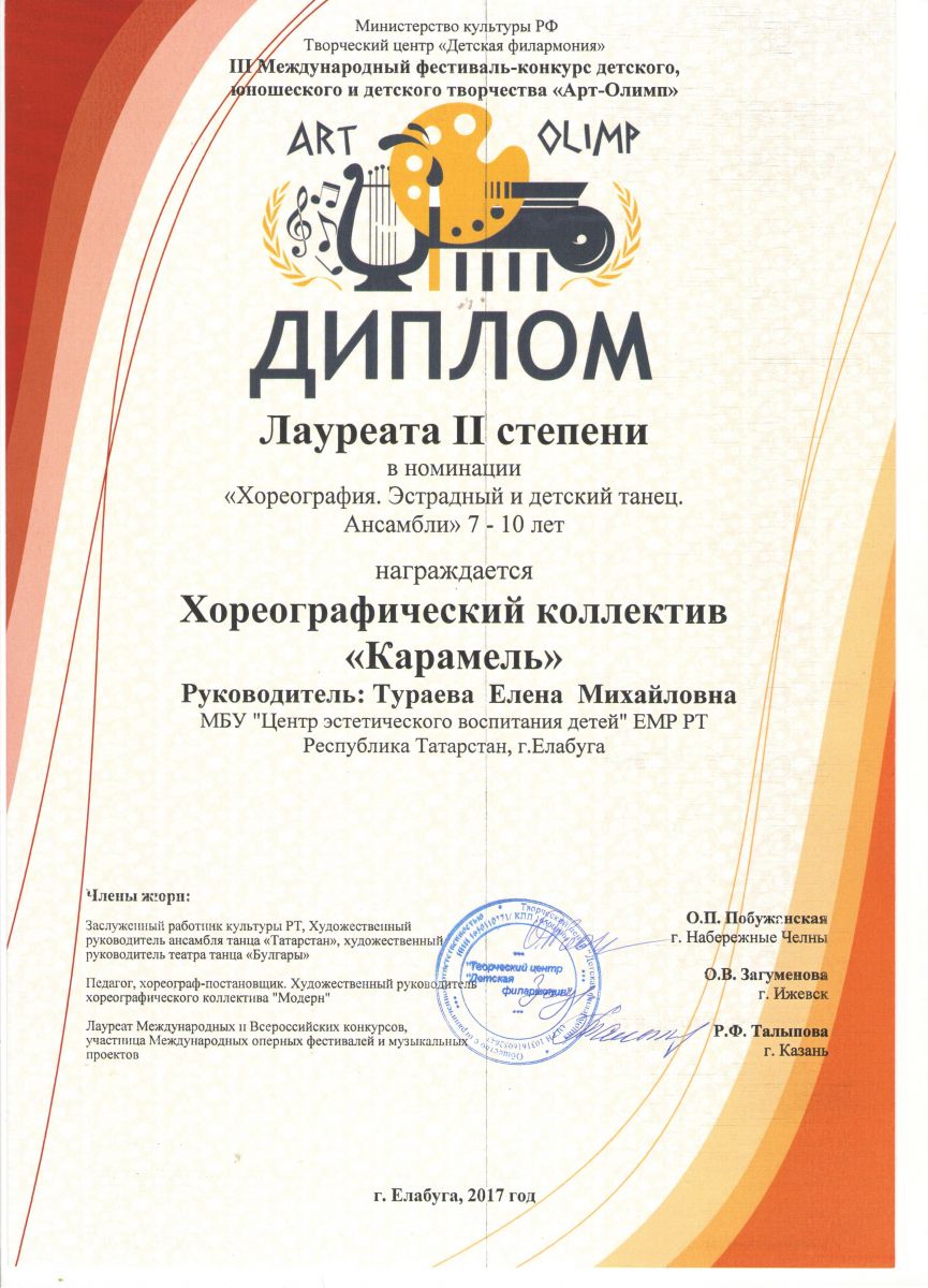 3. III фестиваль – конкурс детского, юношеского и детского творчества «Арт-Олимп»- Хореографический коллектив «Карамель» - Хореография - Лауреат II степени