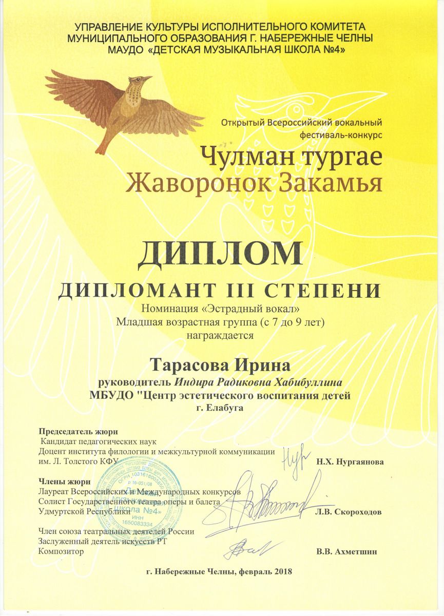 5. Открытый вокальный фестиваль-конкурс Чулман тургае «Жаворонок закамья» - Тарасова Ирина - Вокальное пение - Диплом Дипломанта III степени