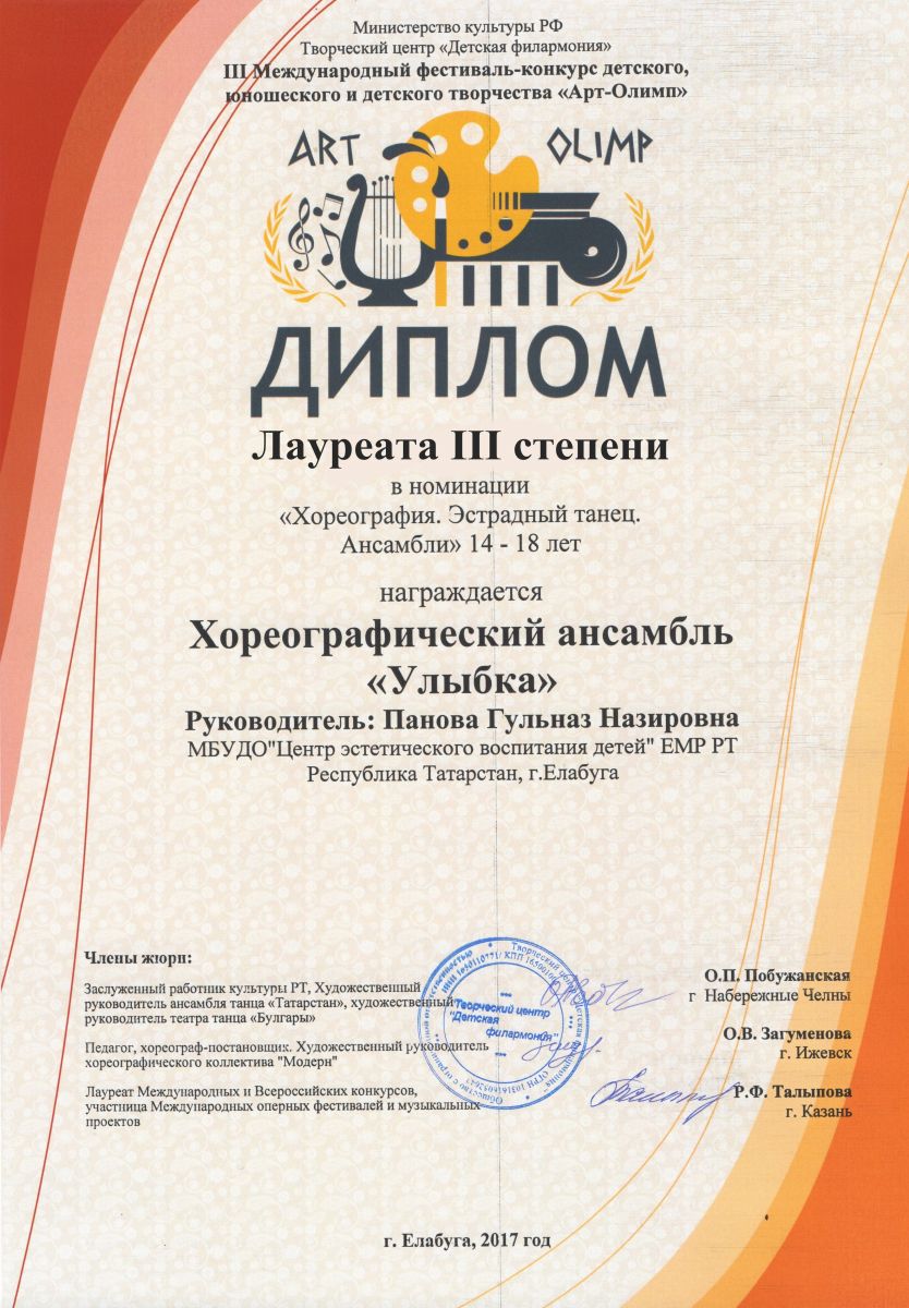 21. III фестиваль – конкурс детского, юношеского и детского творчества «Арт-Олимп» - Хореографический коллектив «Улыбка» - Диплом Лауреата III степени (14-18 лет)