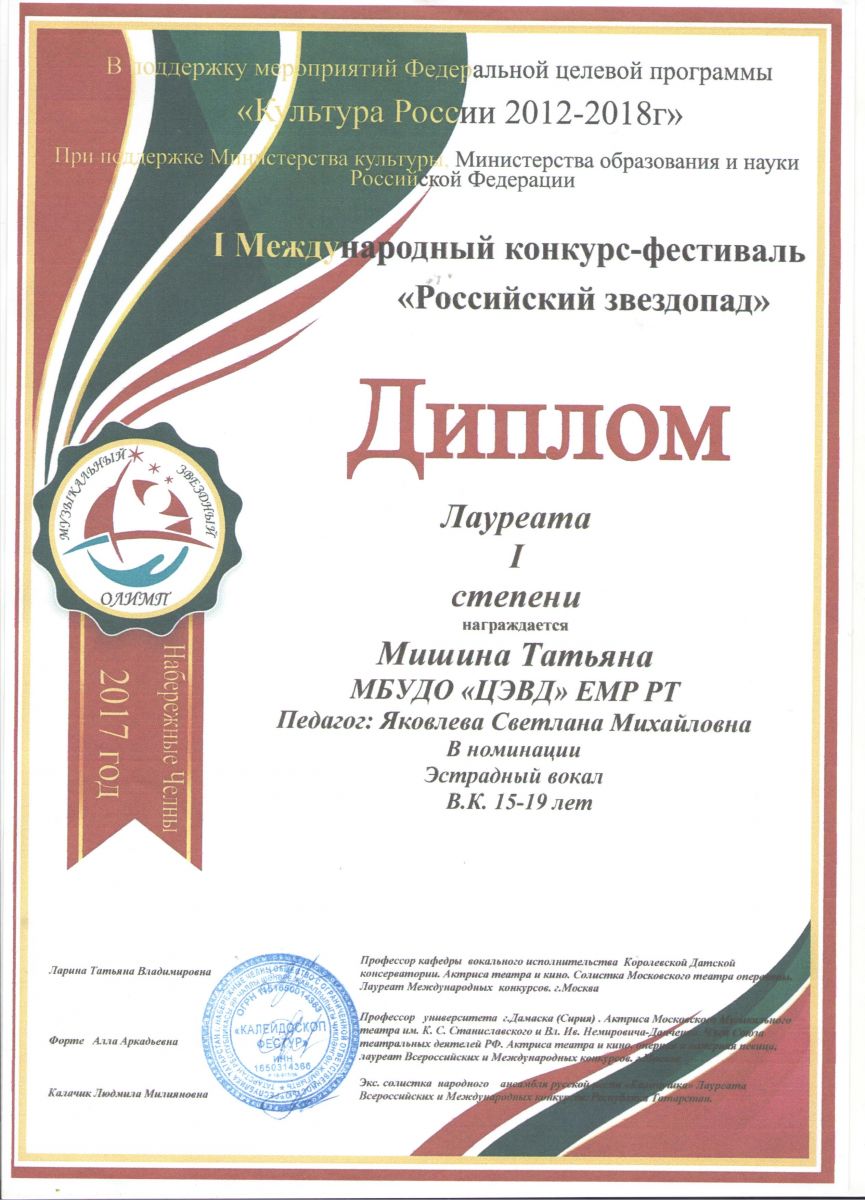 6. I конкурс-фестиваль «Российский звездопад» - Мишина Татьяна - Вокальное пение - Диплом Лауреата I степени