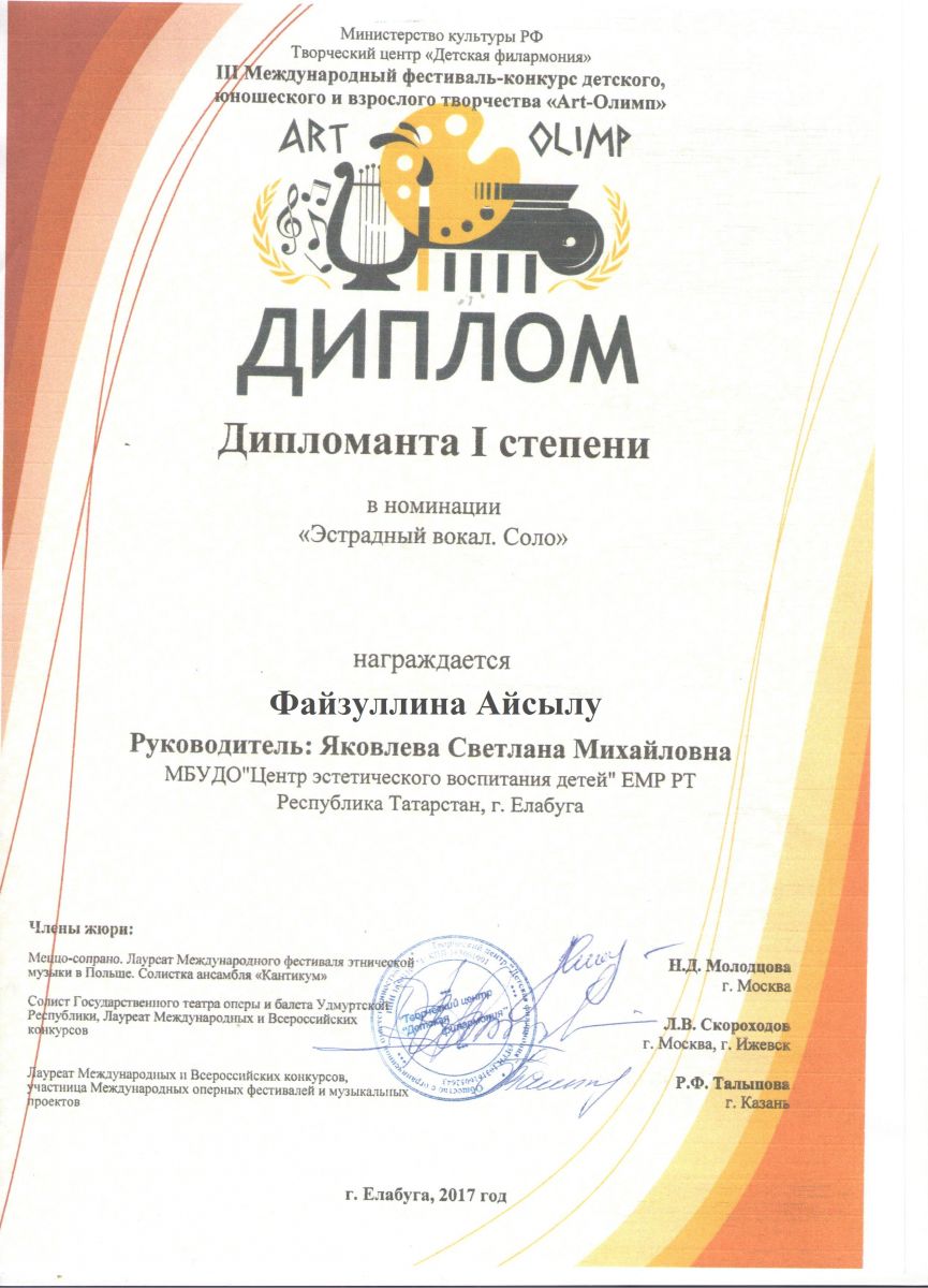 2. III фестиваль – конкурс детского, юношеского и детского творчества «Арт-Олимп» - Файзуллина Айсылу - Вокальное пение - Диплом I степени