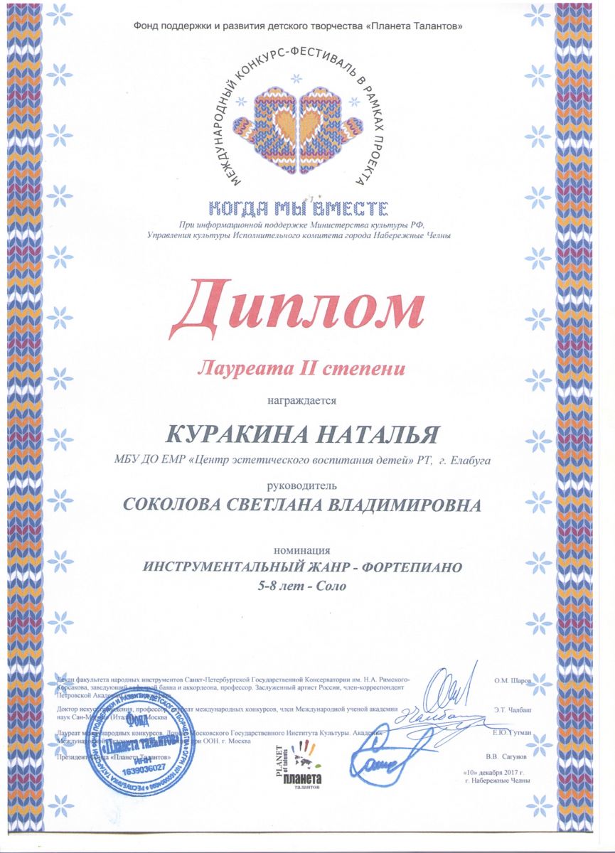 27. Конкурс-фестиваль в рамках проекта «Когда мы вместе» - Куракина Наталья - Теория музыки - Диплом лауреата II степени
