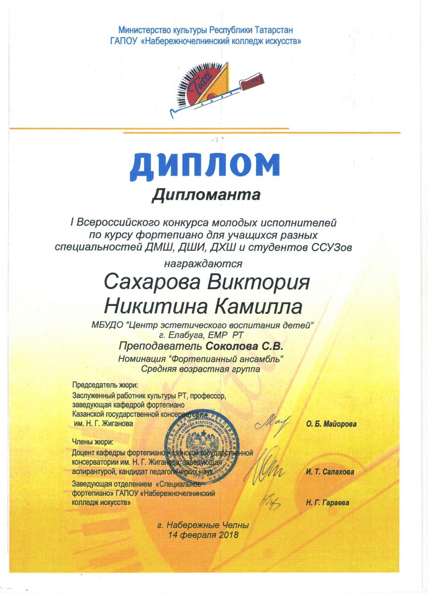 10. I конкурс молодых исполнителей по курсу фортепиано для учащихся разных специальностей ДМШ, ДШИ, ДХШ и студентов ССУЗОВ – Сахарова Виктория и Никитина Камилла - Теория музыки - Дипломант