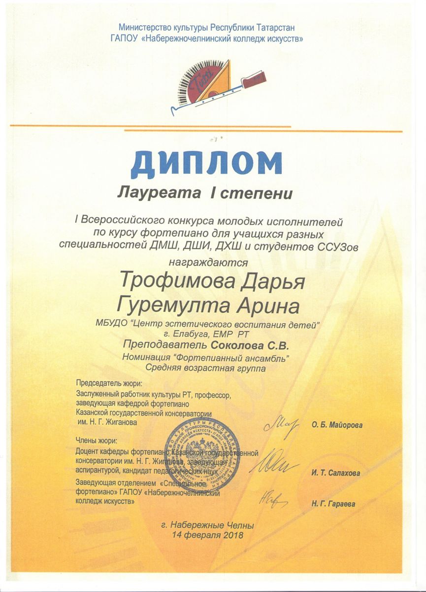 11. I конкурс молодых исполнителей по курсу фортепиано для учащихся разных специальностей ДМШ, ДШИ, ДХШ и студентов ССУЗОВ - Трофимова Дарья и Гуремулта Арина - Теория музыки - Диплом лауреата I степени