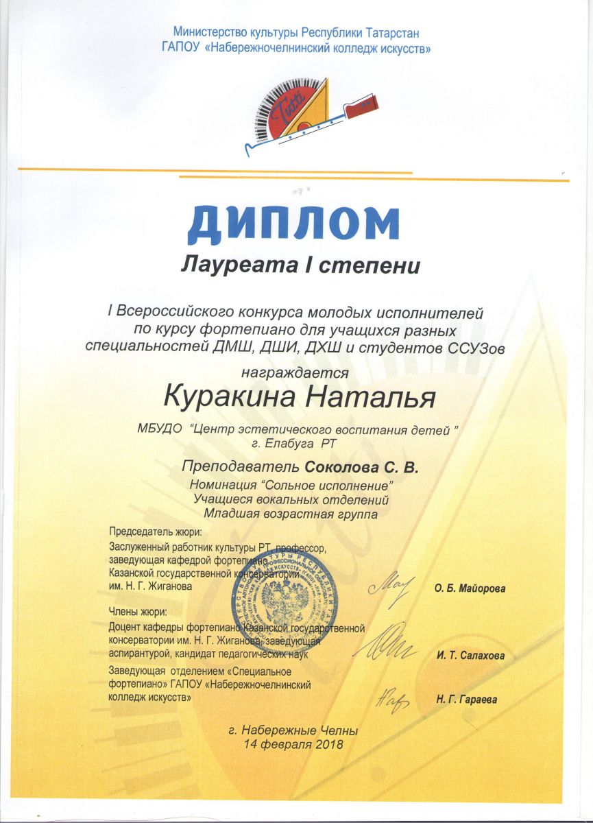9. I конкурс молодых исполнителей по курсу фортепиано для учащихся разных специальностей ДМШ, ДШИ, ДХШ и студентов ССУЗОВ – Куракина Наталья - Теория музыки - Диплом лауреата I степени