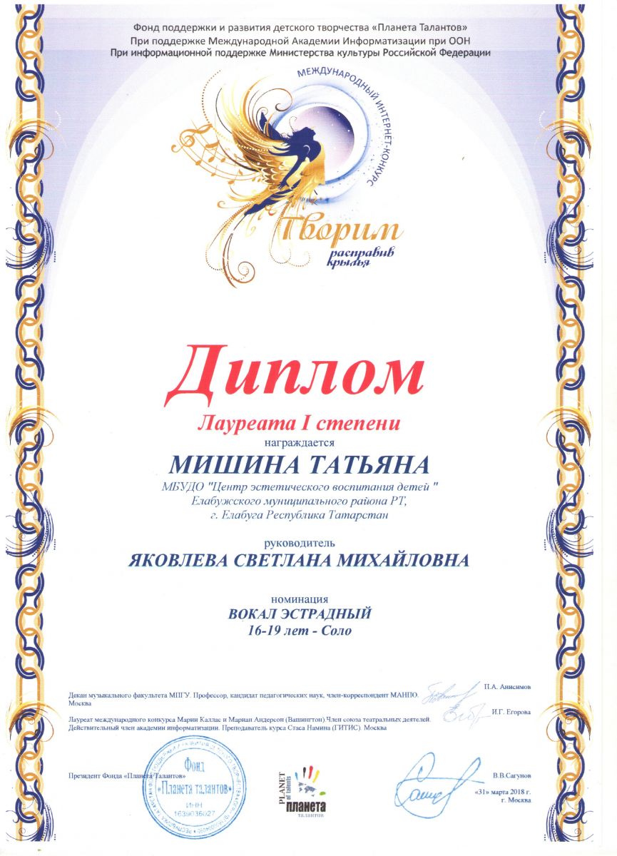 10. Интернет-конкурс «Творим на крыльях ветра» «Планета талантов» - Мишина Татьяна - Вокальное пение - Диплом Лауреата I степени
