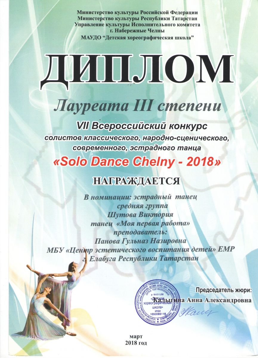 8. VII конкурс солистов классического, народно - сценического, современного, эстрадного танца « Solo Dance Chelny- 2018» - Шутова Виктория – Хореография - лауреат III степени,