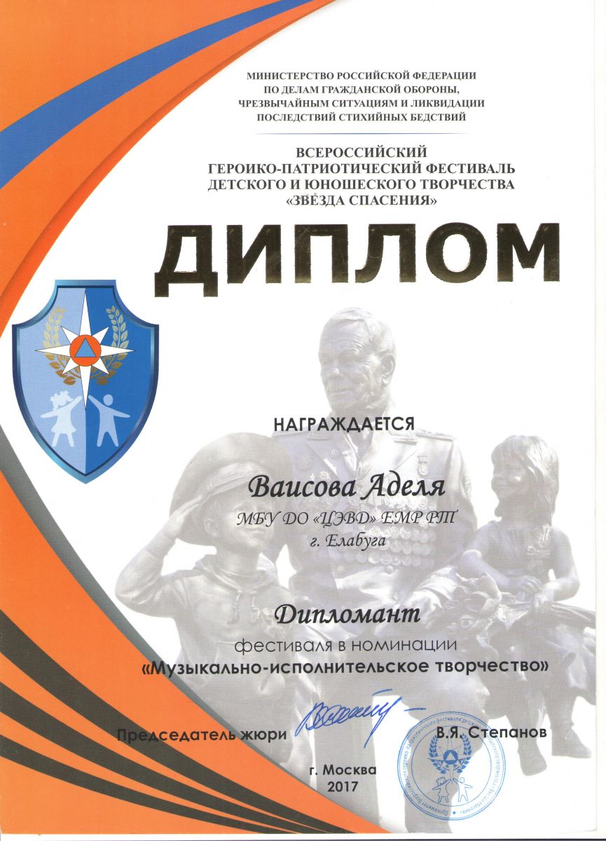 3. Героико-патриотический фестиваль детского и юношеского творчества «Звезда спасения» - Ваисова Аделя -Музыкально-исполнительское творчество - Дипломант