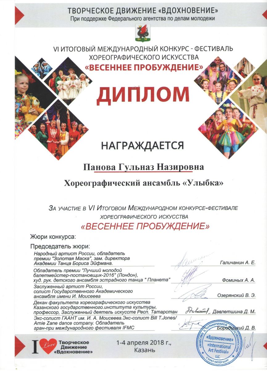 11. VI Итоговый конкурс- фестиваль хореографического искусства «Весеннее пробуждение» - Хореографический коллектив «Улыбка» - Хореография - диплом