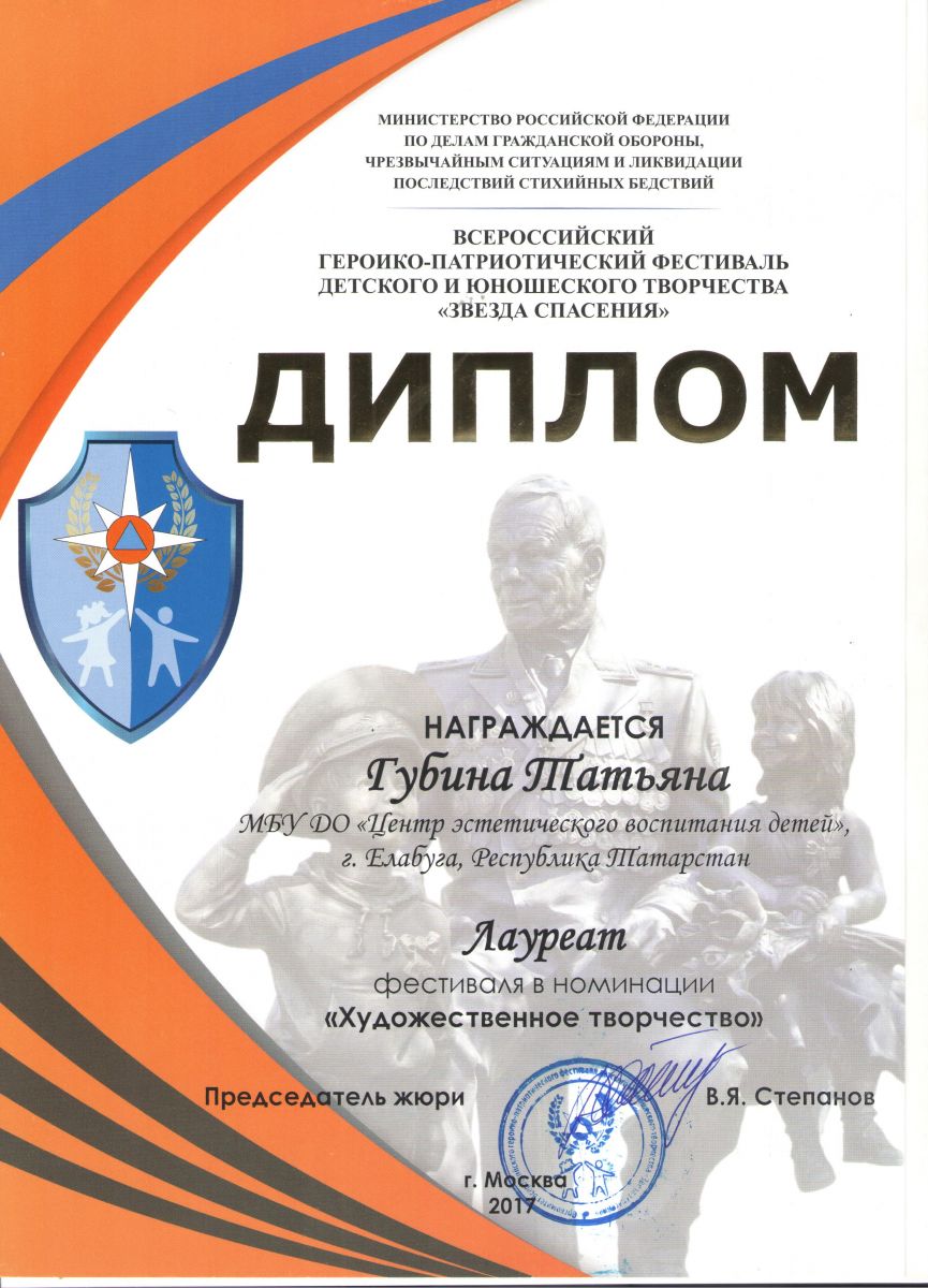 4. Героико-патриотический фестиваль детского и юношеского творчества «Звезда спасения» - Губина Татьяна - Художественное творчество - Диплом лауреата