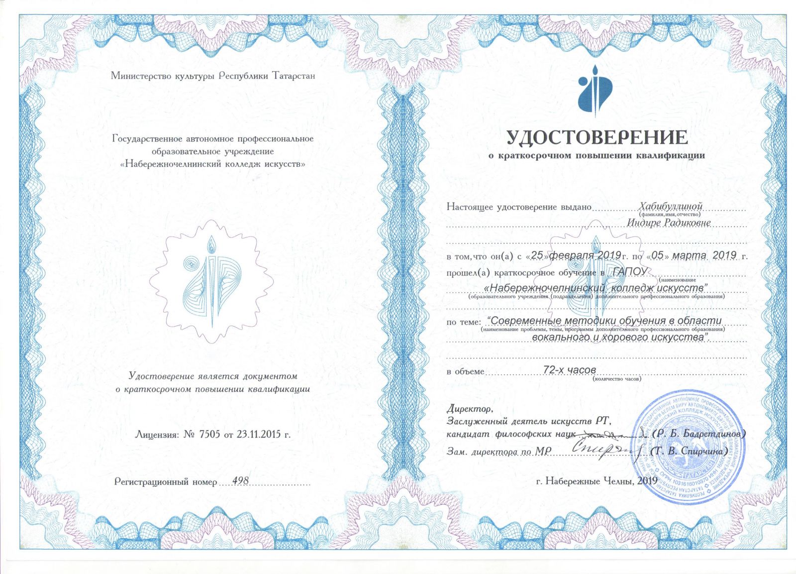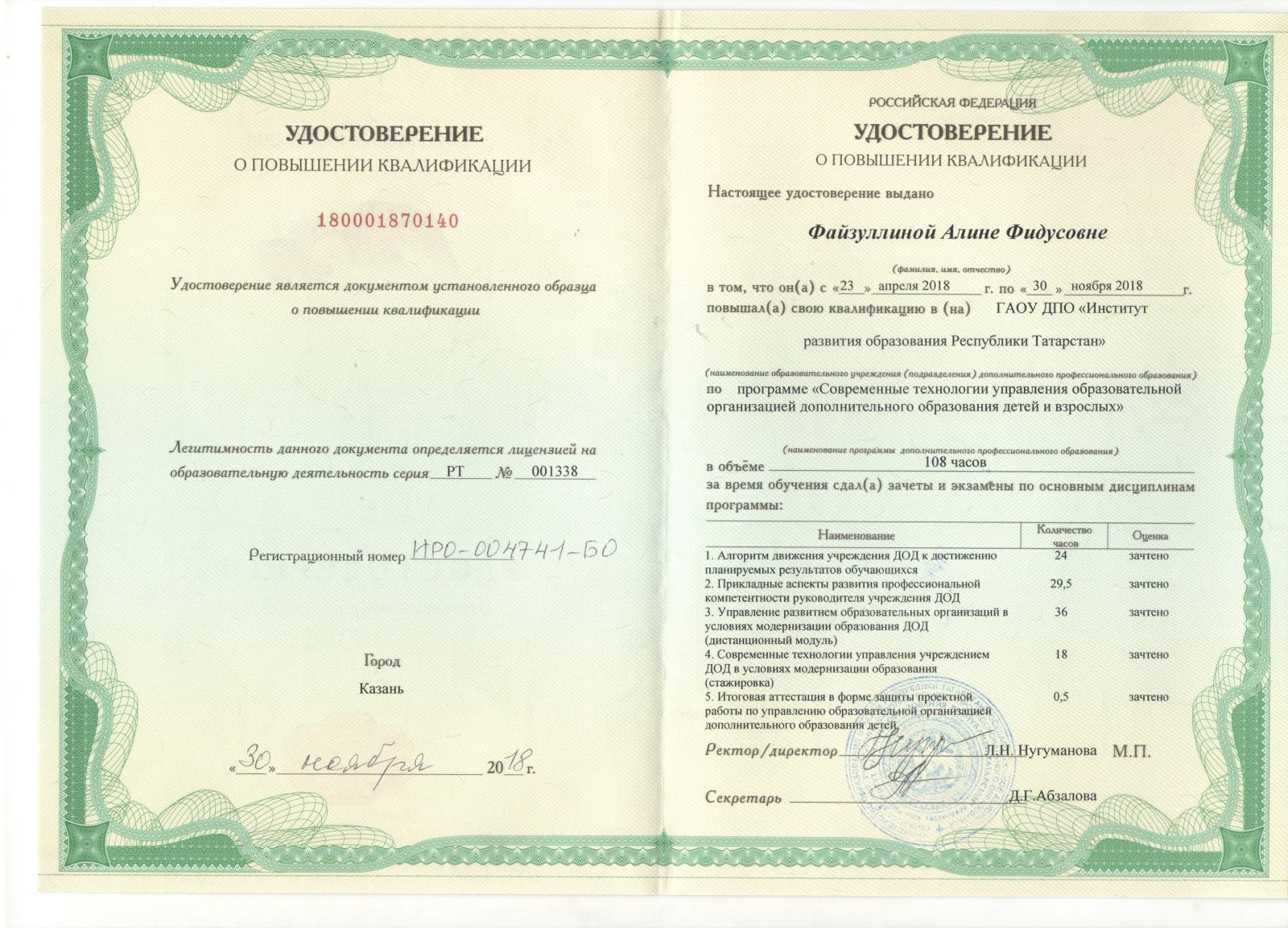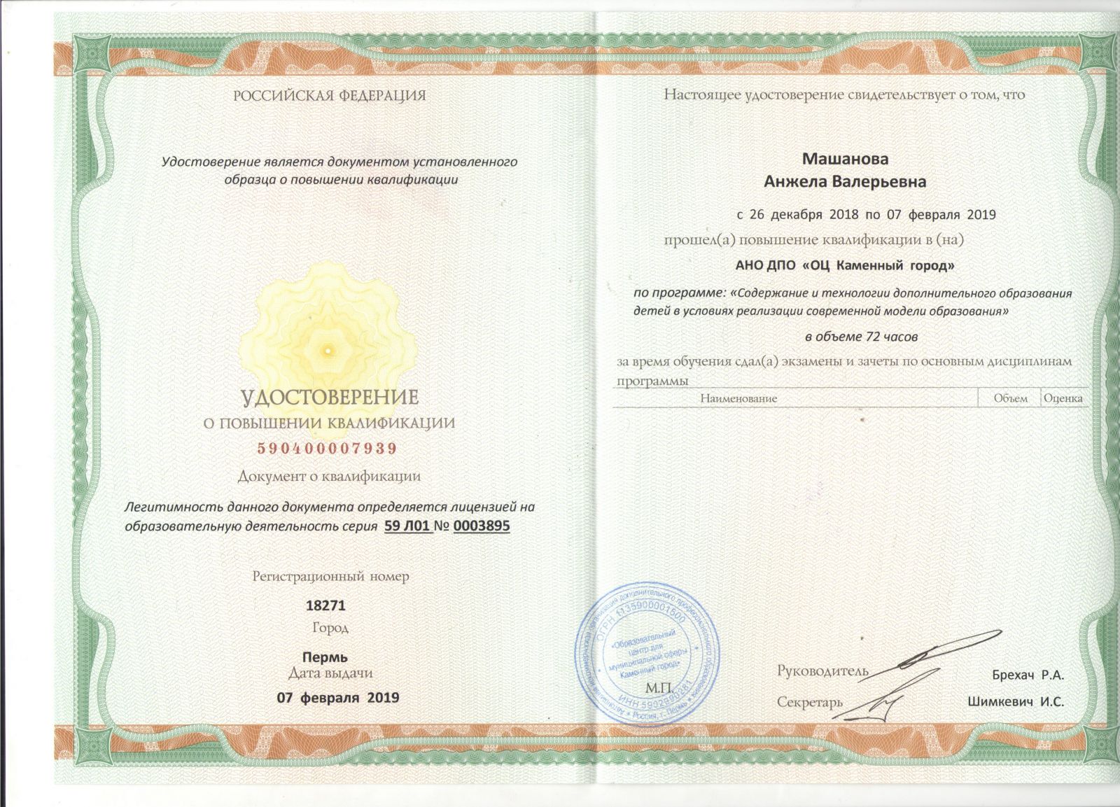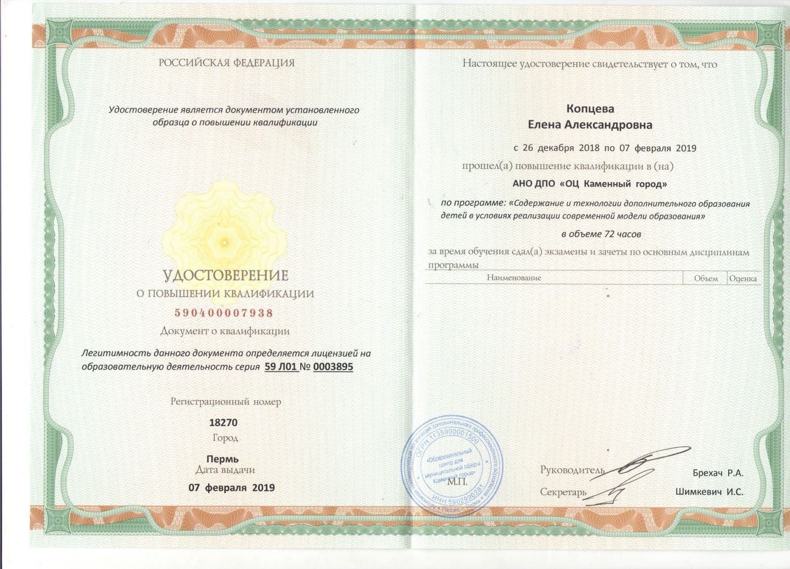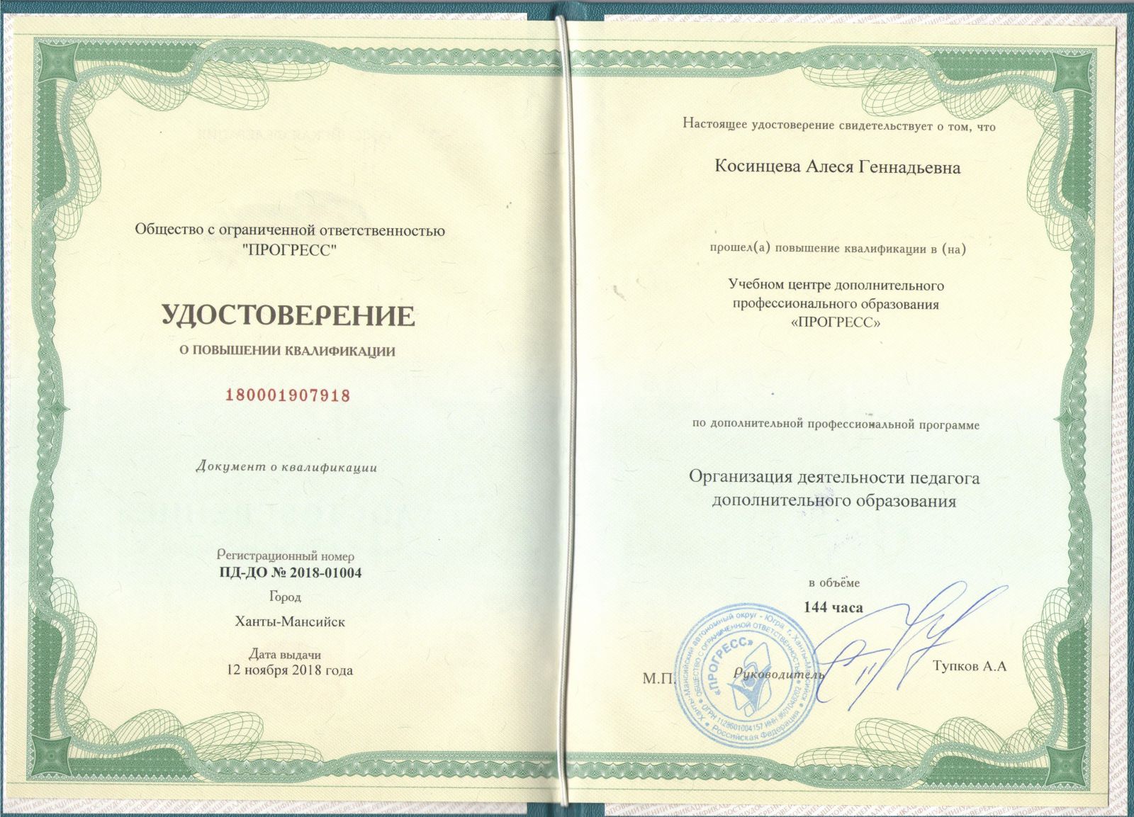 1. Косинцева А.Г. 2018г. «Организация деятельности педагога дополнительного образования». 144 часа.